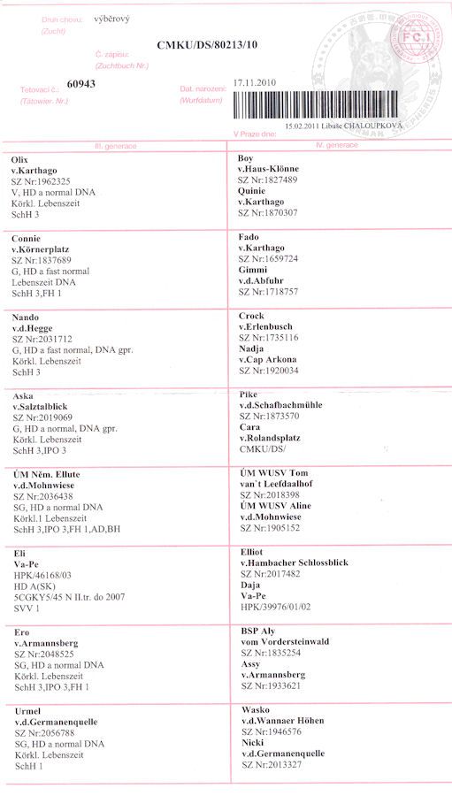 性别:母 生日:2007-11-28 FCI国际血统证编号:CMKU/DS/67864/07/11 Titled:ZVV1 Show:vyborny(excellent) Breed Survey:1st Class(一级繁育等级) 5CV1/P Elbows,hips:0/0;0/0 售出时间:2013-1-28 其它: